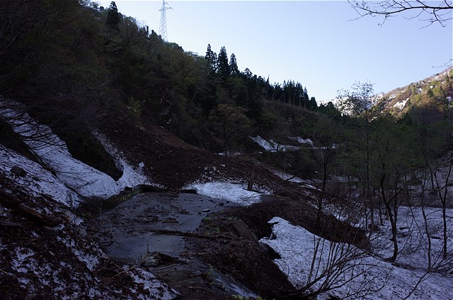 6:41 林道分岐は川沿いに下る。右岸は大量のデブリに埋まる。
