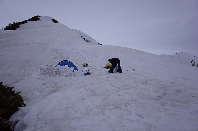 15:26 雨が降って来た、予報通りだ。急いでテントを設営する。雪を掘り下げてテント周囲に壁を作る。少しは風をしのげるか。