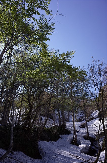 14:51 ヤブを避けるため雪をつなげながら登る。
