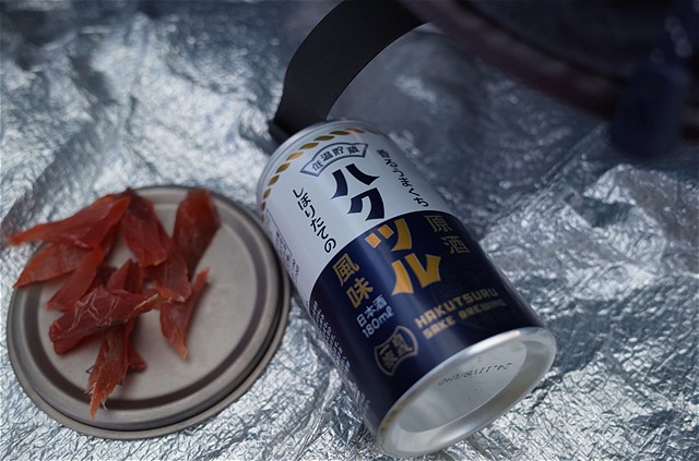 16:23 飲みます。鮭とばをナイフで削ってしゃぶりつつ、ハクツル原酒をきゅいと口に含む。汗をかいた身体に、塩気が効く。