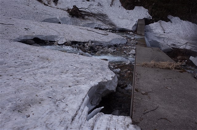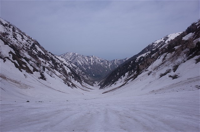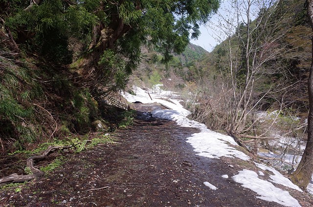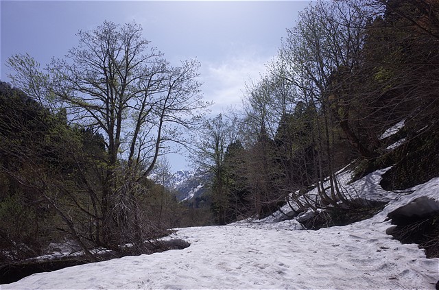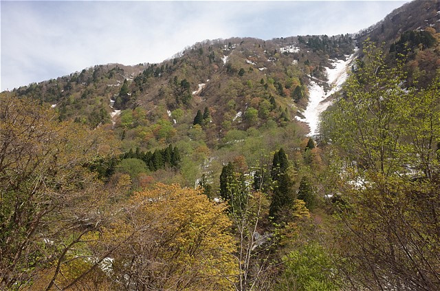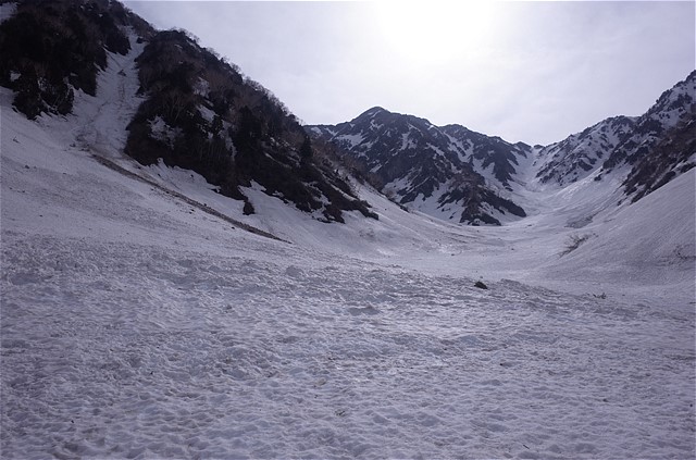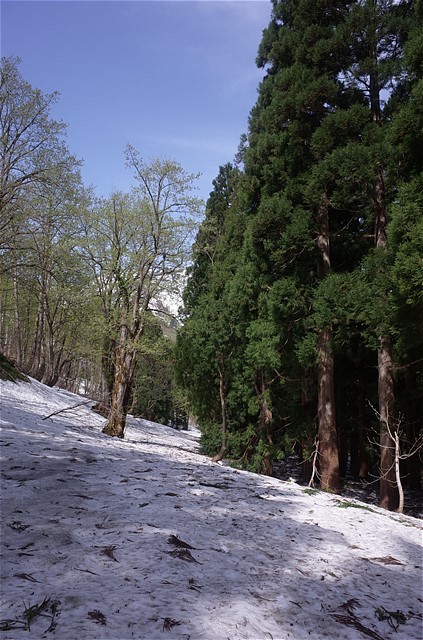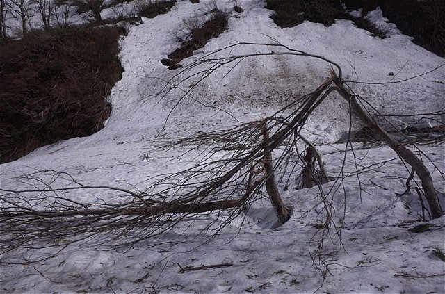 8:50 雪崩でへし折られた樹木を谷の中で数多く見た。