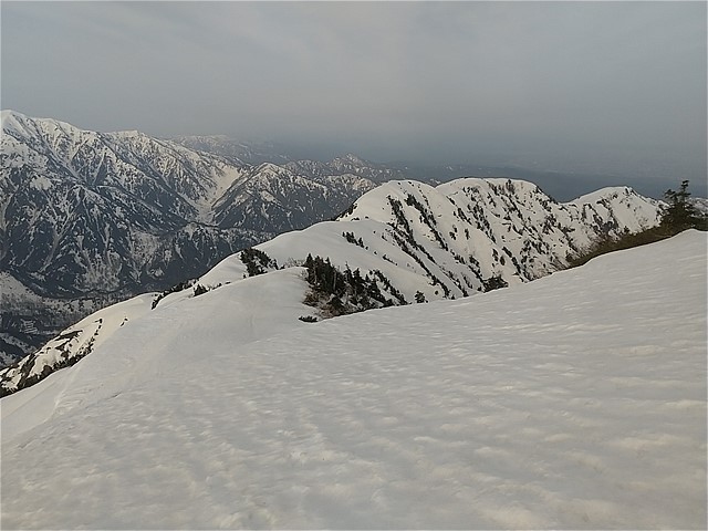 6:05 猫又山のニセピークでガイドパーティーと交差する。ガイド込みで4人、4人、3人がロープでつながっている。ブナグラ峠にテントを置いて毛勝三山のピストンだとか。