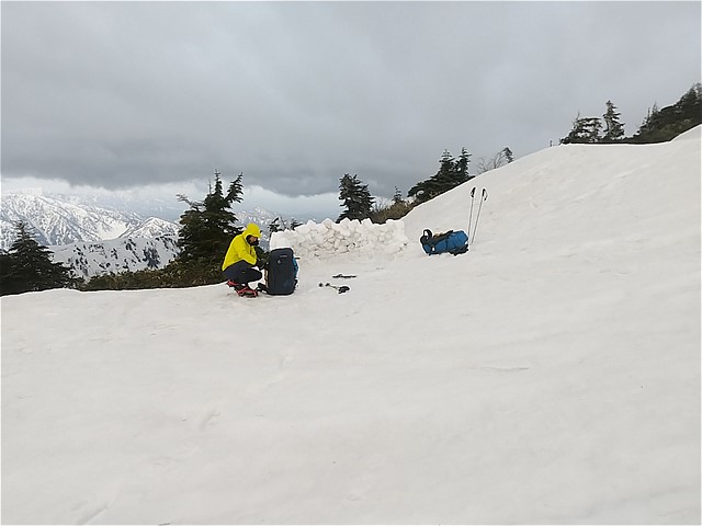 6:36 猫又谷のコル。谷から風が吹き上げてくる。気温-2.5℃。前述のパーティはテント周りの雪壁をしっかり作ってあるなあと感心。