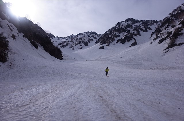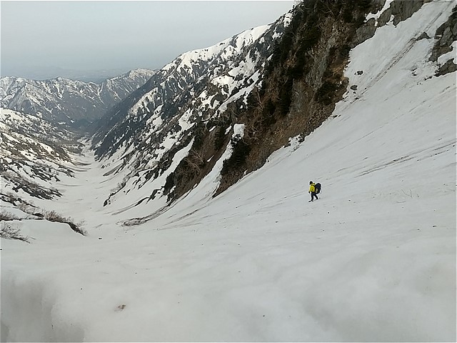 谷の上部は角度が急だ。アイゼンがよく効くので恐怖感はない。