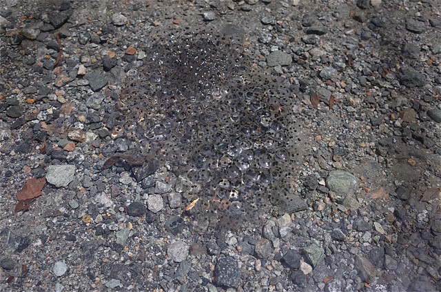 道路の水溜まりの中には、モリアオガエルの卵塊が点在している。時間の経ったものは、オタマジャクシになっている。