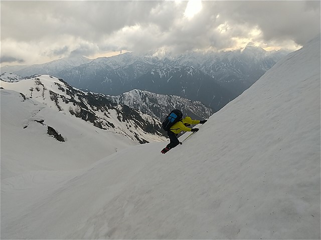 ピッケルにした方がいいかなあという斜面があったが、二人ともダブルストックで通してしまった。