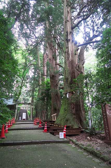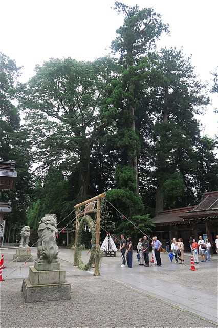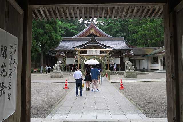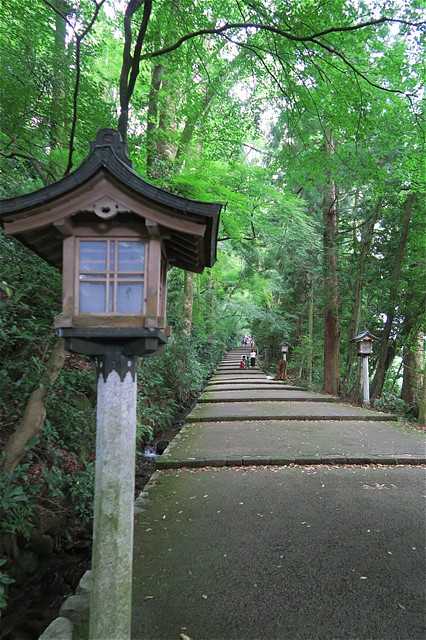 11:32 169813km 白山比咩神社(表参道)。加賀一ノ宮。雨が降ってきたので傘を持つ。駐車場はほぼ埋まっているほどの人気。