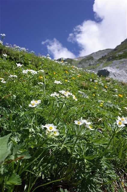 東一ノ越までの登山道は、お花畑だ。クルマユリ、ハクサンフウロ、ハクサンイチゲなど、青い空に映える花々。