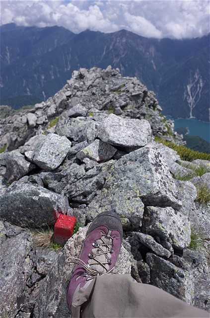 10:26 東一ノ越。尾根の平坦部である。黒部ダムが見えた。ここで水分補給(無塩トマトジュース)とヘルメット着用。