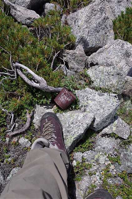 錆びた空き缶が落ちている。雄山南稜は特に難しいところはない。ハイマツのヤブコギに体力を奪われるくらい。
