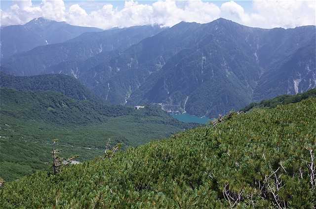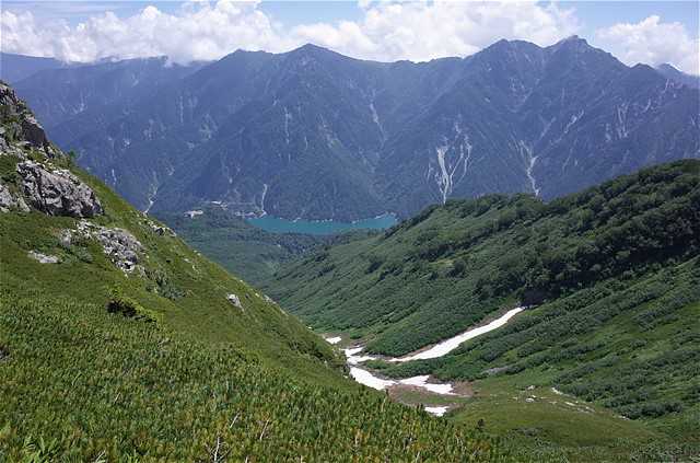 黒部ダムと後立山連峰の景色を楽しみながら進んでいく。ところどころに踏み跡らしきものがあり、それをつないでいくと登りやすい。