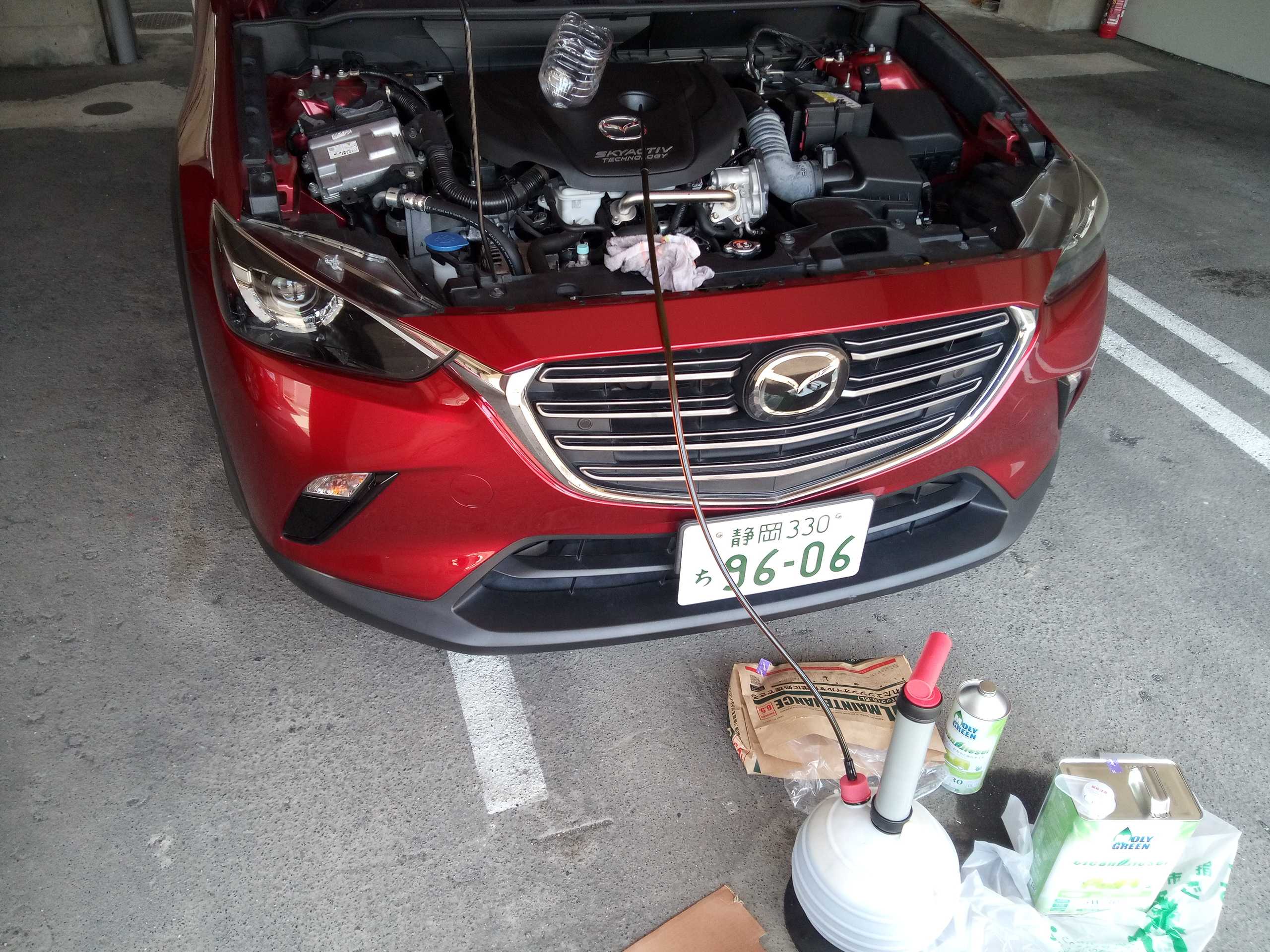 みなさんこんにちは。暑い日が続いて大変ですね💦💦はやく涼しくなってもらいたいです。さてタイトル通りCX-3のオイル交換を行いました。いつも上抜きで交換してます。車を上げなくていいので楽ですよ。モリグリーン モリグリーン クリーンディーゼル 5W-30 4L DL-1 0470125使用したオイルは↑のものになります。個人的にはdl-1の4L缶では最安値かと……こちらが3000km走行したオイルです。完全に墨汁です(笑)シビアコンディションでも5000km交換でも良いそうですがこの汚れを見ちゃうと早く替えたくなっちゃいますね。またこれで気持ちよくドライブできます😃手動式オイルチェンジャー 容量6L N015使用しているオイルチェンジャーです。