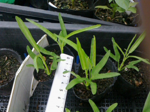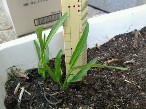 2012年05月03日に種まきしたアサガオナを定植しました。普通だと3粒植えて1本を間引きし、とあったので2本残してみました(^^;あと株間は50cmとあったのですが、このプランタでは大きくならないもしれないので無視してこんな間隔で植えちゃいました。さてどうなるのでしょうか?