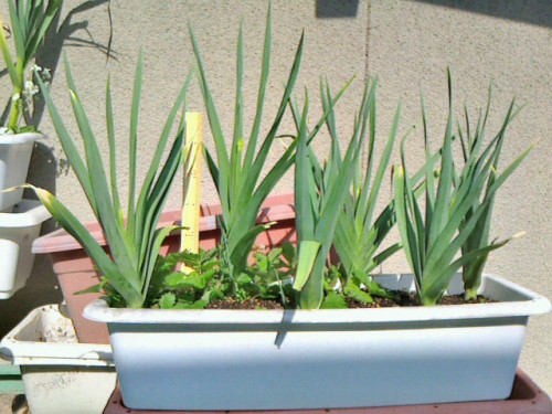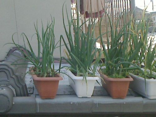 ニンニクの芽がそろそろ出始めてきました。芽は摘んだ方が球が大きくなるらしいけどいつ摘むのが正解なんだろう???昨日産直市でニンニクの芽を売っていたのですが、それは頭(ネギ坊主に育つところ)付きで売られていて、普段よく食材として目にする茎の部分は15cm無いくらいの長さでした。来週ぐらい刈ってみようかな。。。無臭ニンニク(2012/10/01植付け 2012/10/16定植)↑背丈40cm程度と有臭と比べて小さい。球を植えてからのスタートダッシュは早かったのですが、この大きさで止まっている感じ。まあ1cmぐらいのものを植えてここまで育ったのだからOKでしょう。有臭ニンニク(2012/10/01植付け 10/29定植)↑背丈60cm程度と無臭を追い越しています。が、葉の状態は非常に悪いです。収穫時期が近くて枯れ始めているのではなく、ずっとこんな感じです。こちらも2cmぐらいの球を植えてこれですから良しとしましょう。ニンニクの芽どのニンニクも写真写りが良くて立派に育っているように見えるのですが、結構状態はよくありません。葉色が非常に良くないんです。この写真が比較したもの。左3つのプランタがタマネギ、右2つが今回のニンニクちゃんたち。タマネギの青々しさに比べて、この色の薄さ(T_T)