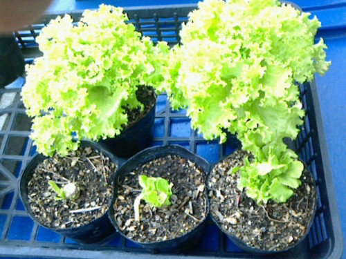 4月30日に、根元からバッサリ刈ったリーフレタス。切り株から葉っぱが出てきています。上の2つは刈り取りしなかったもの。下の3つが刈り取ったもの。右の成長は結構速い。
