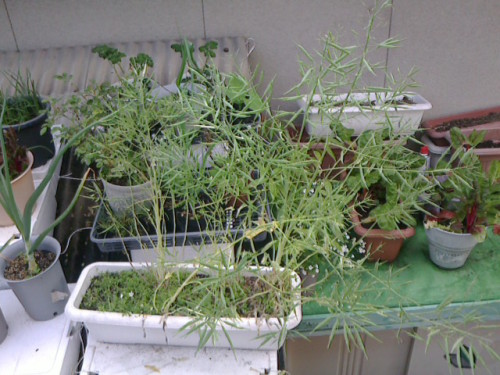 種採りを待つミズナです。こんな感じで、沢山実をつけています。(手前白いプランタ)。コマツナ同様こちらも1か月後ぐらいには種採りが出来そうです。この中で2本は巨大ミズナ※で、そのうちの1本の根元は以上に太くダイコンのようになっています。こんなの初めて(☆o☆)※巨大ミズナ:屋根上農園特産の葉がやたら大きいミズナです。
