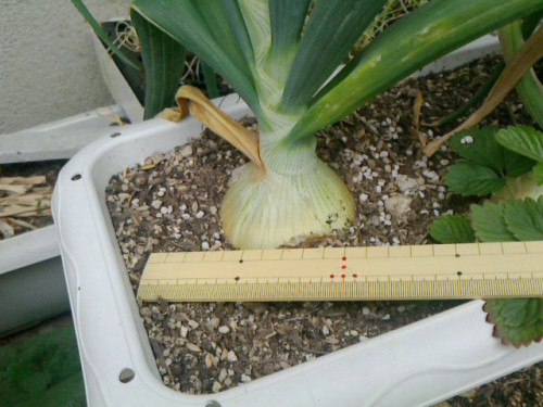秋に定植したタマネギの様子です。写真の左3つがタマネギのプランタです。3つのうちの右と真中は去年11/3に植えたもの。一番左は今年の2月頃植えたもの。去年定植のものは大きいもので写真右のように4cmぐらいに膨らんできています。今年植えたものは写真左のように1.5cmぐらいでまだまだ膨らんでいません。収穫はいつごろになるのかな?