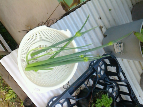 15cm前後に伸びたニンニクの芽を刈り取りました。太いのは無臭ニンニクのもの。極細の2本は有臭ニンニクのもの。これからもわかるように有臭ニンニク危ういです。。。。刈り取ったものは、今晩のおかずページへ。。。非常に柔らかかったです(^_^)V