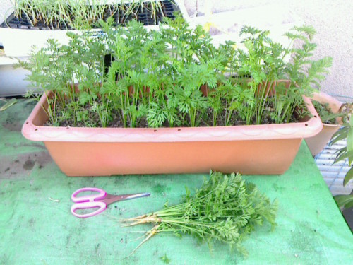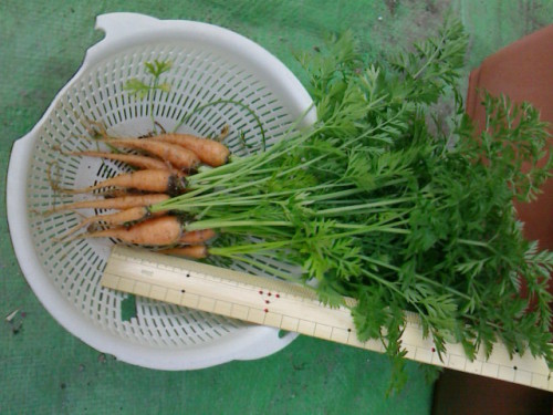 2012年04月29日に間引いたニンジン。第2回目の間引きです。これで2cm間隔ぐらいになりました。今回は、根がちょっとニンジンぽくなっています。色はまだ赤くはないですが、肌色って感じ。間引いたものは、今晩のおかずページへ。。。