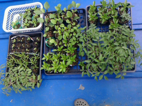 3月11日に蒔いた種がやっと定植できそうなので本日定植に踏み切りました。とはいうものの、ミニトマト以外はちょっと苗としては小さいかなという感じです。我が家の苗君たちです。屋根上農園ではプランタへの定植が基本です。でプランタの盛り方の話。よくTVでは、軽石とかの鉢底石を敷きなさい、と言っていますが、屋根上では使わなくなりました。植物は根の張る広さしか地上部も育たないのです。だから鉢底石を使うとその領域の分地上部が育たなくなるわけです。深いプランタならともかく、我が家は浅いプランタなので、ますます育たない理屈になります。それに代わって今やっているのが、以下の方法です。石の代わりに枯葉やもみ殻を使います。プランタの底には、昔使って処分することになったすだれを網替わりに敷きます。そしてその上に枯葉を敷き詰めます。枯葉は10月に公園でかき集めたものです。このすだれと枯葉で土が流れるのを防ぐわけです。すだれが無くても枯葉だけでも大丈夫です。その枯葉の上にもみ殻を敷き詰めます。去年はもみ殻だけで3cm位の厚みに入れたりもしましたが、今回はカップラーメンカップ1杯ぶんしか入れていません。もみ殻は水分を保持させることを目的とします。多い方が良いかも???さて、これが鉢底石と大きく違うのは、根が伸びてくればどんどん食い込むことです。そして最終的には腐葉土的な肥料になることです。ただ肥料として期待できるのは、今回の収穫を終えて、次の野菜を植えた時です。土は写真に撮ってませんが、前回収穫を終了した時の土に、昔の撤収野菜の茎や葉を乾燥させたものや、堆肥を少々混ぜて、今日まで寝かせたものですそして今日、・葉かきした葉を乾燥させ小さく刻んだもの。・1プランタに、移植ごて1杯ぐらいの堆肥肥料・あと牡蠣殻石灰とBMヨウリンを軽く一握りづつ堆肥はTVなどでは土1:堆肥1:腐葉土1にするとか言っていますがそんなにたくさん入れると、いくら発酵完熟堆肥といえどプランタでは悪臭がしてきます。(うちで買ったのが完熟じゃない???)牡蠣殻石灰とBMヨウリンなんぞも使ってますがBMヨウリンは高いので、将来的には苦土石灰に戻そうと思います。肥料の量は少なめです。基本的に前の野菜を育てているとき、追肥追肥で育てているので、栄養分は前のものがたくさん残っているのではと、思うのでそうしています。
