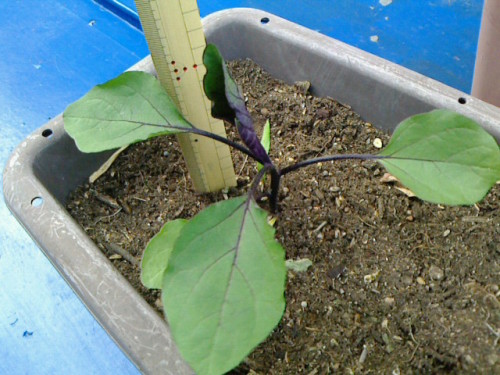 まずはナスの定植。ちょっと小さ目だけど、まあ去年の親は10円の苗だったことを考えると上出来でしょう。1プランタに計2株定植しました。