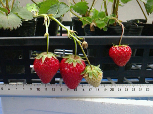 イチゴの収穫をしました。収穫できたのはこの3つです。甘くておいしかったで~す(*^o^*) 。しかし実はこの収穫したイチゴは、バックアップ用にポリポットに植えているもの。本番のプランタ植えのイチゴはというと、、、、時に一番下の写真の株は、せっかくたくさん実をつけようとしているのに、芯止まりしてしまって、新しい葉が一枚も出てこないのです。これでは美味しいイチゴは期待できません(T_T)やっぱり葉の調子が悪くまともな葉が付いていません(T_T)で、多くの株が、まともに実が付いていないんです。どうも今年もダニ被害のような、、、今年は「粘着くん」が効かないみたいなんです。アルコールでも蒔いてみようかな、ファブ○ーズが効果あるのなら、アルコールで行けそうなんですが?????かなりひどい状況ではあるのですが、3品種ある中で、章姫が割と調子よいです。今日収穫した大きい方は章姫です。2枚目の写真の株も章姫です。