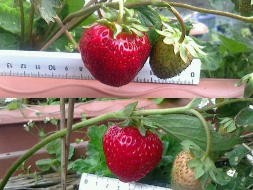 たった2個ですがイチゴが真っ赤に色づいたので収穫しました。どちらも紅ほっぺです。4cm台の屋根上としたは結構大ぶりなイチゴです。朝食に美味しくいただきました(^^)v