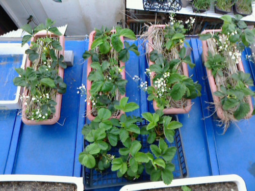 今年はイチゴの調子が良くありません。(去年もこんな事言ってた気が(^^;;;;(各プランタに2株計8株。手前のイチゴはバックアップ用にポリポット植えしているもの。)実は、お手入れが十分でなく、4月に入ってもあまりに株が小さく、この葉の枚数ではとても実は育たないと、花芽を摘んだりもしていました。(まあ今年は徹底的にわき目を摘むというのが遅すぎ、全体的に育っていないというのも原因ではあるのですが)また3月末頃ゾウムシの被害があったりして新葉がやられたりもしてました(あれからコマメにゾウムシ退治してその被害は止まっています)現在まで少しは葉が育ったのですが、未だに実がなるには程遠いです。↑やっと1つ花が咲いている感じまた育ち始めたものの葉の調子が悪いです。去年はダニにやられてましたが、今年はちょっと様子が違うのです。写真左のように葉が縮れたり、大きく育っても写真右のように凸凹な葉になります。やっぱりダニのような虫にやられているのか?病気なのか?肥料が悪いのか?悲しいのはプランタの株より、バックアップ用にポリポット植えしている株の方が景気が良かったりします。プランタ株はそこそこ根が育っていると思うので、今さらバックアップと交換という訳にもいかないでしょう……