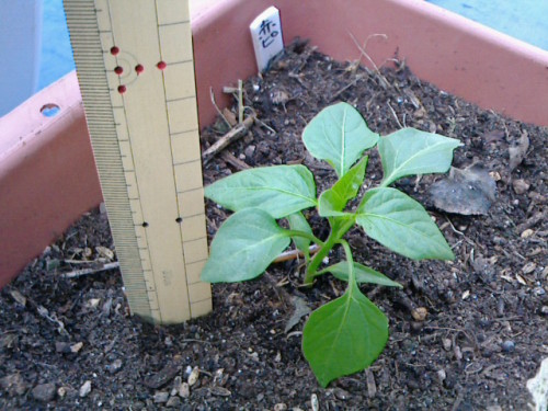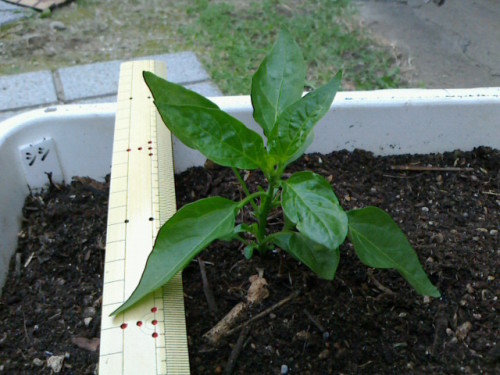 次はピーマン。ピーマンもちょっと小さい。背丈が10cm行ってません。ピーマンはなぜか葉が縮れてくちゃくちゃになってうまく育たないんです(写真撮り忘れていました)。たぶんアブラムシのせいだと思っているので、今年は結構気が付くとテデトールを行っていたのですがやっぱりかなりやられています。今回はその被害の少ないものを選んで植えました。定植したピーマンは基本的にカラーピーマンで・レッド=産直市で購入したピーマンからとった種を去年植えて、今年も植えた2代目・オレンジ=去年スーパーで買ったピーマンの種を植えたもの・イエロー=去年スーパーで買ったピーマンの種を植えたもの各2株づつ、計6株定植完了