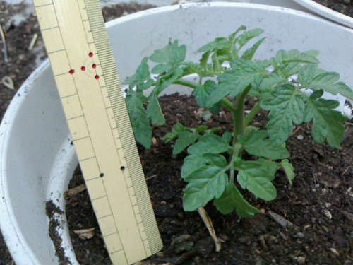 本日の定植最後はベランダトマトです。これは去年売れ残りの苗を買って育てたものにたった1個実が熟し、たった4個の種が取れ、それを今年植えてできた苗です。十分にしっかりした苗になった感じです。下の写真の白い鉢植えの2株が今回定植のベランダトマトです。そしてカップラーメンの上に乗っけた苗は普通のミニトマト。苗の大きさというか葉のつき方自体が別物です。これで本日の定植はすべて完了です。プランタ7つ+2鉢の土をコネコネしたので今日は大変な1日でした。