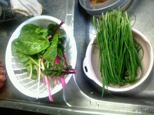 前ページ紹介の今日の収穫「ニンジン(間引き)、ニンニクの芽、スイスチャード」に加えてニラも収穫しました。ニラは1か月前ぐらいに収穫して、今年2度目の収穫です。写真左スイスチャード・写真右ニラで、今夜の晩御飯はこちら。。。えーと、キムチがなぜか食べないうちに賞味期限切れで(^^;それに収穫物と豚肉白菜等を加え、豚キムチ風野菜炒めです!間引きニンジンの茎はちょっと固い感じでしたが、ニンニクの芽は柔らかかったです。まあ屋根上農園では100点です!!