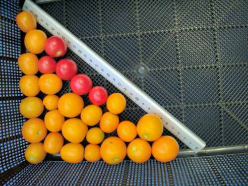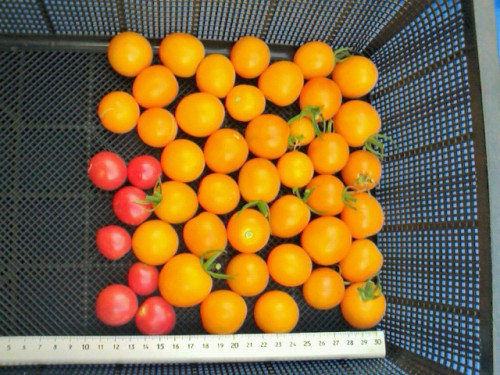 ミニトマトの今期初収穫です。こちらは恒例の黄色ミニトマトこちらはベランダトマトベランダトマトは萎縮ぎみで、少し徒長させる為に日蔭で育てていました。↓本日の収穫です。ベランダトマトはサクランボぐらいの大きさです。日蔭で育てたせいかちょっと酸っぱい。黄色の方はそこそこ甘いです。