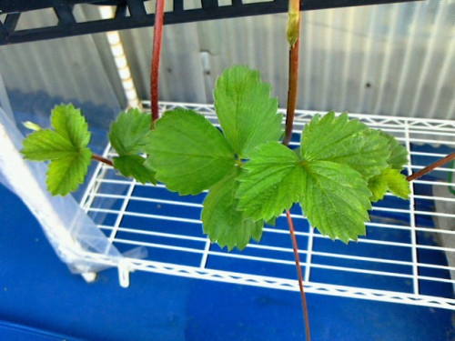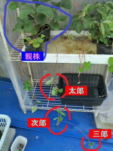 今日はイチゴのランナーの鉢受けを行いました。今年はダニと思われる症状で葉が枯れていきもうダメかという状況でしたが イチゴの燻煙殺虫作戦が成功しなんとかここまでこぎつけました。ランナーの鉢受けはこんな感じで行います。●まずはイチゴのランナーの説明から。写真Aのように、イチゴは親株からランナーと呼ばれるツルを伸ばし、その先に子株となる部分を作っていきます。子株は、親株に近い方から、太郎、次郎、三郎……と呼ばれます。通常イチゴは新しい品種を作るとき以外は種は蒔かず、これらの子株を植えていくことで繁殖させます。写真A●鉢受け子株が写真Bぐらいの大きさ以上になると鉢受けします。(これより小さいものはまだ鉢受けする必要はありません)この大きさになると青の部分に示すように根が出始めているはずです。まず赤で示す部分の小さな葉は取り去ります。この葉があると泥をかぶるので病気になりやすくなるのでとった方が良いのです。(注意:クラウンと呼ばれる葉の付け根の部分からは新葉が生えてくるのですが、そちらは取っちゃダメですよ!)写真B次に写真C左のようにU字の針金を作ってください。(これは去年使用したものを再利用です)#18(直径1.2mm)の針金を9cmに切り曲げたぐらいがちょうどよいかと。これを写真C右のようにクラウンの部分にかけて使用します。写真C90mmぐらいのポリポットに土を入れ、少し硬めに押さえます。通常の植物では鉢植えするとき土はあまり押さえないのですが、針金で止めるために心もち硬めにすると良いです。写真Dのように、クラウンの背が見える状態に植えます。植えるというより根の生える部分を地面と接触させ針金を地面に挿し固定させる表現が正しいです。針金で止まっているのが少し写真では分かりづらいですね。その針金のすぐ右横には、取ってはいけない新葉の生え始めが綺麗な黄緑であるのがわかりますか?写真Dこれで完了したのが写真Eです。親株との位置でランナーのテンションをうまくとってやり、植えた子株がうまく直立できる位置に配置します。左が親株、右が太郎君です。我が家は親株もポリポットです(^^; 今年はプランタが失敗したので、バックアップ用にとっておいたものがそのまま親株となりました。これでも親株は120mmのポリポットなのですが遠近法で同じに見えますか。。。写真E●お手入れ写真Fの紫で示す部分は、ランナーの太郎・次郎・三郎の流れとは別な部分から枝分かれしたものが生えてきています。これは脇芽で、太郎・次郎・三郎の本流を成長させる為に、矢印のところから取去ってやります。生えてきたら随時取り去ってください。写真F●完了写真Gは我が家の完了風景です。まだ小さな子株は鉢受けせず残します。このように台に乗せて育てる場合、ランナーは下にたらすのがお勧めです。理由は、、、葉がまっすぐ伸びるんです。。。。写真G章姫5株、幸の香3株、紅ほっぺ2株鉢受けしました。●今後3週間以上すれば、根がしっかり張ってきて、親株からの切り離しが可能です。