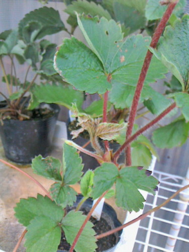 瀕死の状態だったイチゴから、とても綺麗な葉がが出ています。今年の株で春以降これだけ綺麗な状態は初めてです。蚊取線香による燻煙大成功!!!(^o^)V(蚊取線香による燻煙作戦については→2012年06月24日イチゴの燻煙殺虫作戦)合計4回ぐらい燻煙したかな。