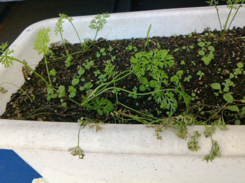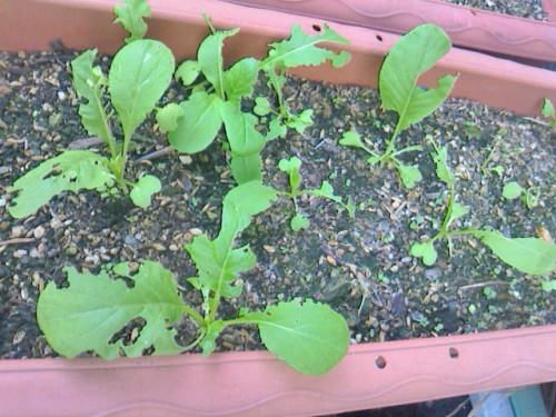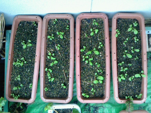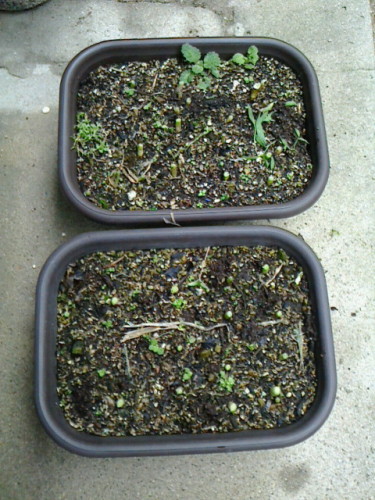 タマネギ等を収穫して次の野菜に準備していたプランタから生えてきたものがあります。最初は双葉を見ていつものミズナのこぼれ種だと思っていたのですが、ちょっと違うようです。どうやらコマツナのこぼれ種のようです。最近の豪雨で折れてしまっているものもあるのですが、結構頑張っているので次の野菜で必要になるまで育ててみようと思っています。