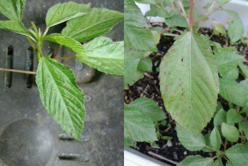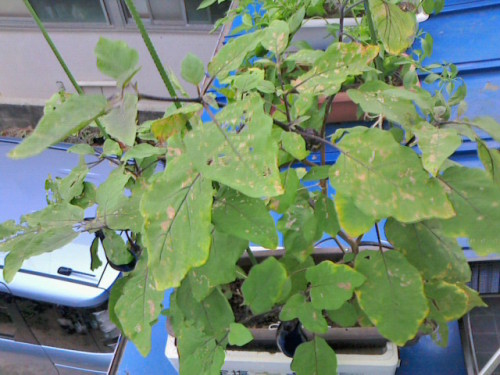 毎年の事ですがモロヘイヤの葉に細長く切れます。(写真左)モロヘイヤの特徴?それとも虫食い?調子の悪いものは、写真右のように茶色い斑点がでてきます。目に見える虫は、時々小さなカナブンやカメムシを見かけますが、こういう葉の食べ方はしないし、、、とりあえず蚊取り線香作戦です。全て摘心して脇芽に期待です。