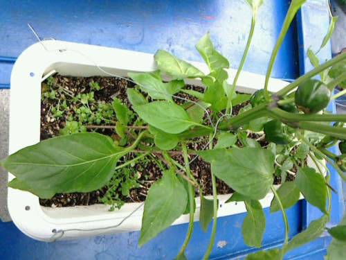 ナスに続いてピーマンも支えてやりました。ピーマンは支柱は使わず針金&ヒモで支えるのが屋根上農園方式です。まず、針金で以下のようにV字に支えます。(V字のとんがる部分は1回転させ株の主芯をやさしく包みます。#18(直径1.2mm)の針金なので、ふにゃふにゃなんですが大丈夫です!反対側の株も同じV字で支え、1回転させた部分同士を麻ひもで引き合わせます。つまり>---<な感じになっています。完成写真です。(よく見えませんね(^^;ピーマンのプランタはいくつかあるのですが、今日はこのプランタだけで時間切れです。他のはまだまだ大丈夫そうという理由もあります。。。