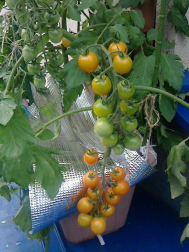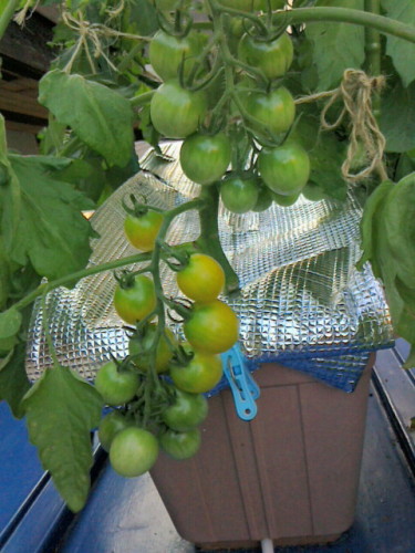 ミニトマトが今日の暑さで色付き始めました。たしか朝見たときは全然色づいていなかったのですが。このトマトは黄色い品種なのですが、実際にはオレンジっぽい色になります。もう少しです、頑張れ!!あとナスに続き、ミニトマトにも乾燥対策です。こちらは数年やっている銀シート(食器棚シート)作戦です。この作戦、水がやりにくいのが難点です。