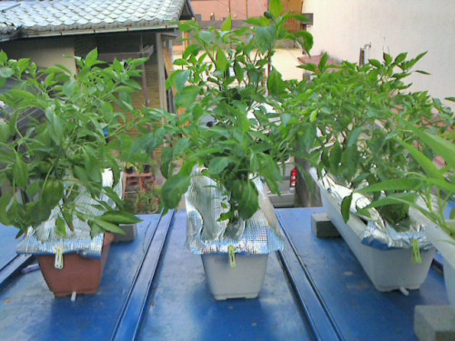 夏も本格化し、プランタの水が夕方には乾ききるようになりました。銀シート(食器棚シート)作戦です。ミニトマト(黄色)は早くから行なっておいたのですが、今日はピーマンとシシトウを行いました。あとプランタチームは、・モロヘイヤ……結構ヤバいので近々作戦必要。・アサガオナ……なんとか大丈夫そう。鉢植えチームで、ベランダトマトがヤバそうです。こちらは底面給水で対応しようと思っていますが……