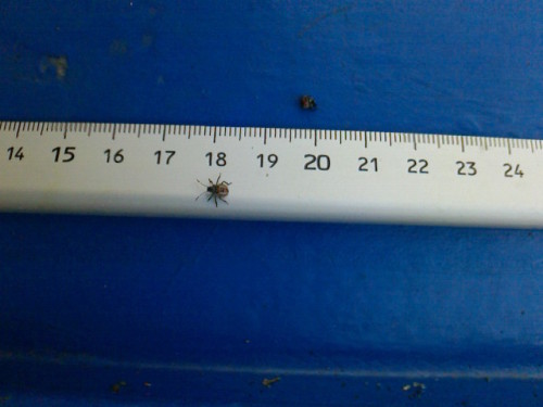 今日は梅雨の合い間の晴れで良い天気でした。そんな中、ナスのプランタの乾燥が激しく夕方にはしおれているので、給水システムの設置です。去年も行った、プランタを発泡スチロールのプールに漬け込む作戦です。去年の発泡スチロールを出してきて、作戦完了です(^^;水は明日の朝入れます。ナスのプランタは、底が網になっているのでこの作戦が有効です。この方法は、長期に渡りつけると根が腐るので、朝入れた水が夜残っているようなら出来れば夜の間はプールから出した方が良いです。ただ結構そこまで監視するのは難しい(^^;;まあ水の深さは、傾いている片側の深い方が5cmぐらいなので、3日ぐらいパナシでも今までは大丈夫でした。さて、迷惑なお客さんがやってきました。↓ニジュウヤホシテントウ(テントウムシダマシ)です。たぶん写真右がその食害痕。上記の被害はたいしたことないのですが、下写真左のように食い荒らされた葉もあります。この葉は実は先週には食べ始められていて、今日見たらこんなことに!!!そしてその被害の始まりはたぶん写真右のような1cmぐらいの食害から始まっていると思うのですが、こういう食べ痕のほとんどに、蜘蛛の巣のような糸が何故かあるのです。まるで葉巻虫みたいに。。。ただこの糸の周りに蜘蛛や葉巻虫のような虫がいるわけでなく????いったい何者なのでしょうか?
