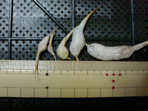 去年秋に食べた後のダイコンの1cmぐらいの首を植えたもの。04月30日に花を咲かせていましたが、やっと種が完熟しました。1株しかなかったため、他殖性植物(他家受粉)であるダイコンで、受粉し種化したのは下の写真の物だけ。つまり1株からこれだけの実しかならなかったということです。この実やたら大きいんじゃないですか?(☆o☆)このサヤに入っている種は大豆ぐらいあるような????よく果実を大きくするのに、摘果して栄養を集中させるのと同じことが起こったのでは?さてワクワクしながら、種を見てみました。ガーン、中身はしょぼい!大豆には程遠い。ちょっと大き目な気がしないでもないけど、普通のダイコンの種でしょうか?ちゃんとした種を見たことがないのでわかりません(^^;さて、過去にみなさんが疑問に思われた、このダイコンの地下部分はどうなっているだろうという件ですが、残した首、つまり「本来の大根」から細い根が出ています。この細い根だけで花を咲かせていた訳ですね。残念ながら、「大根の再生」はありませんでした。。。