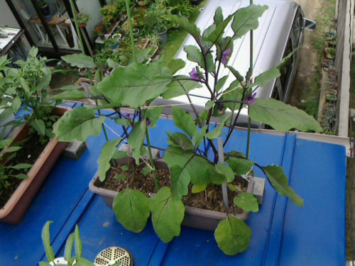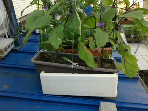 ナスに支柱を立ててやりました。ミニトマトで行った方法で1プランタ3本方式です。主芯が中央に来るよう麻ひもで誘引しました。ナスはやっと実が付き始めました。まだ1cmぐらいで、しおれた花びらに隠れています。