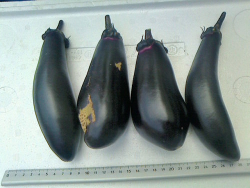 シシトウに続きナスも好調です。今期初収穫です。2012年07月01日に実が付き始め約2週間で収穫にこぎつけたことになります。本日の収穫はこの2つ。残念ながらひとつは虫に穴を開けられていました。昨日発見し退治した謎の虫ですが、葉の裏を見ると今日も合計7~8匹発見しました。今日はちょっと白みがかって、大きさも昨日見つけたものより大きくなっていました。どうもこの虫ニジュウヤホシテントウの幼虫のようです。写真には撮っていないのですが、黄色い卵もたくさんあったのでその卵もニジュウヤホシのもののようです。昨日掲載の写真ニジュウヤホシテントウの被害にあわれた方、一度葉の裏を確認してみてください。きっとこの幼虫と卵があるんじゃないかな?