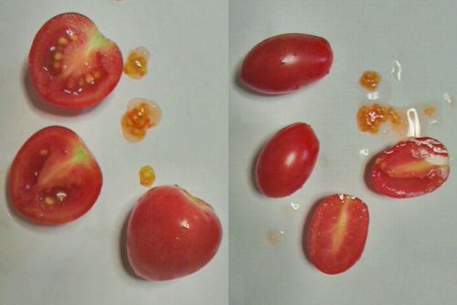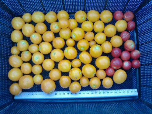 ミニトマトの今期初収穫です。こちらは恒例の黄色ミニトマトこちらはベランダトマトベランダトマトは萎縮ぎみで、少し徒長させる為に日蔭で育てていました。↓本日の収穫です。ベランダトマトはサクランボぐらいの大きさです。日蔭で育てたせいかちょっと酸っぱい。黄色の方はそこそこ甘いです。