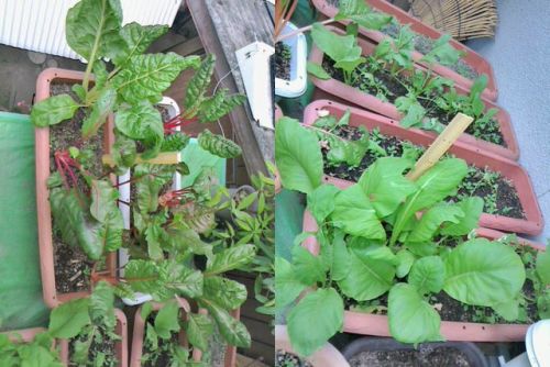 春に蒔いたスイスチャード(写真左)の収穫をしました。蒔いたといっても半分はこぼれ種が育ったものかな。あと、こぼれ種のコマツナもカブラハバチの幼虫に食い荒らされたあと、写真右のように一部の物が育ってくれました。本日の収穫です。おまけのミズナもこぼれ種が育ったものです(^^;