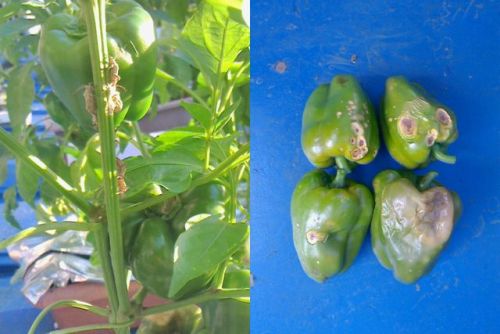 カラーピーマン(パプリカ)の一つの枝に大量のカメムシが(写真左)!!!!こんなの初めて。10匹ぐらい南無阿弥陀仏。。。。。さて実の方なのですが、写真右のように腐れが続発。せっかく大きく育ったのに。写真右下の1個を開いてみると白い部分にはカビが生えていました。色々理由を考えてみたのですが、たぶん引き金は「水切れ」だと思います。屋根上農園ではほとんどの野菜は浅いプランタで育てていて、朝と晩の2回水やりするのですが、この夏の暑さだと、ピーマン・シシトウ・トマト系は、朝やった水は夕方までには完全に干上がってしまい、葉がだらんとしおれてしまいます。そこまでに水をやれれば救いなのですが、仕事の都合上、夜中になってしまいます。銀シート作戦でもこの状況なのです。水切れで、たぶん実の方も水分を失いカサカサになり実が壊死して、その後の湿度でカビてしまうのではと推測されます。肉厚のパプリカ系ピーマンはやっぱり難しいなぁ。。。