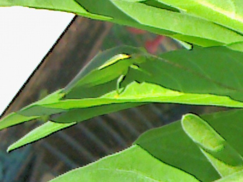 シシトウに続きナスも好調です。今期初収穫です。2012年07月01日に実が付き始め約2週間で収穫にこぎつけたことになります。本日の収穫はこの2つ。残念ながらひとつは虫に穴を開けられていました。昨日発見し退治した謎の虫ですが、葉の裏を見ると今日も合計7~8匹発見しました。今日はちょっと白みがかって、大きさも昨日見つけたものより大きくなっていました。どうもこの虫ニジュウヤホシテントウの幼虫のようです。写真には撮っていないのですが、黄色い卵もたくさんあったのでその卵もニジュウヤホシのもののようです。昨日掲載の写真ニジュウヤホシテントウの被害にあわれた方、一度葉の裏を確認してみてください。きっとこの幼虫と卵があるんじゃないかな?