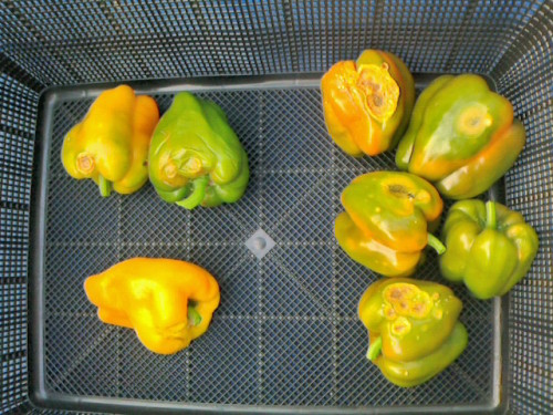 今週の連休は休みがたっぷりとれたのですが、風邪をひいてしまい今日まで寝ていました。取り合えす、カラーピーマン(パプリカ系)を収穫しました。これだけ色づくまで置いていて腐ったのは1個だけでした。気候が良くなったせいでしょうか?しかし葉色は悪く、黄色くなってきています。もう今実を付けているものを収穫したらおしまいかもしれません。