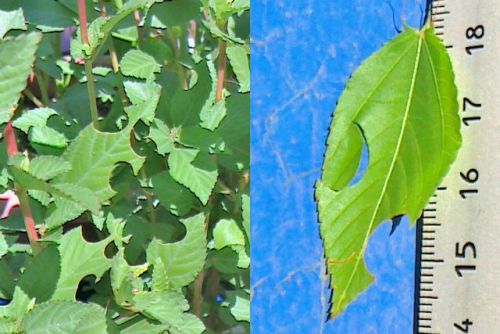この1週間ぐらいでしょうか、モロヘイヤの葉が沢山きれいに丸くかじられているのです。青虫系やバッタ系では、こんなに綺麗に食べるとは思えません。写真右の葉は、丸く切り取った部分が残っています!ますます不思議な虫(?)です。調べてみるとどうもハキリバチの仕業らしいです。切り取る動画があったので見てみると、ものすごい速度で切り取るではありませんか!残念ながらハチは見つけることは出来ませんでした。