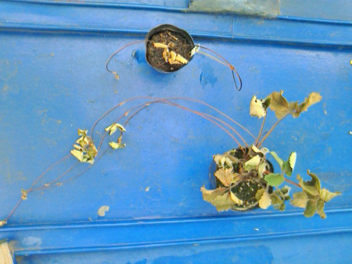 この前定植したイチゴが変です。葉が枯れてしまっています。どうも肥料が濃すぎたのではないかと思います。育ちが遅れているからと言って多めにしたのが間違いだったようです。土を別の物(アサガオナの終了土)を使って定植しなおしました。章姫と紅ほっぺは別の苗が残っていたので新しい苗に変えたのですが、幸の香はまともな苗が残っていないので、枯れ始めた苗を植えなおしとなりました。ここ最近屋根上の世話が出来ず、ナスの実は水分が抜けダメになったりしまいました。発芽したばかりのコマツナも虫がついてしまいました。今年は沢山色々な野菜を作りすぎて世話十分に出来なくなってしまった気がします。今後はイチゴを主軸にして、他の野菜は減らしていく方向でやっていこうと思います。